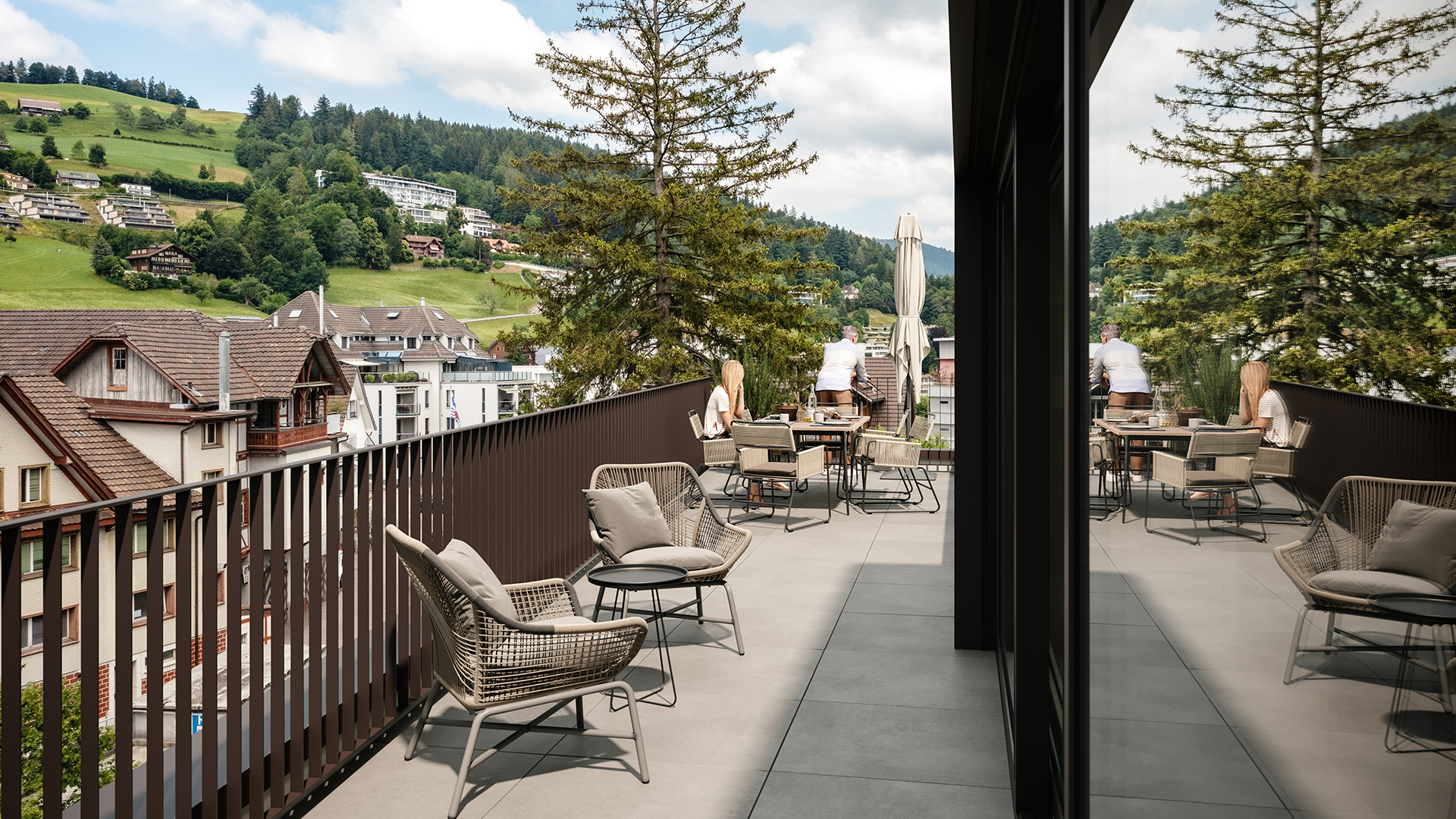 … bevor Sie sich nochmals in den Master-Bedroom mit integriertem Bad & separater Ankleide begeben, treten Sie hinaus auf die grosse Terrasse. Voller Demut beobachten Sie das Flusswasser, dessen sanfte Wellengänge am Dorfkern vorbei, langsam in die Weite hinaus gleiten.
