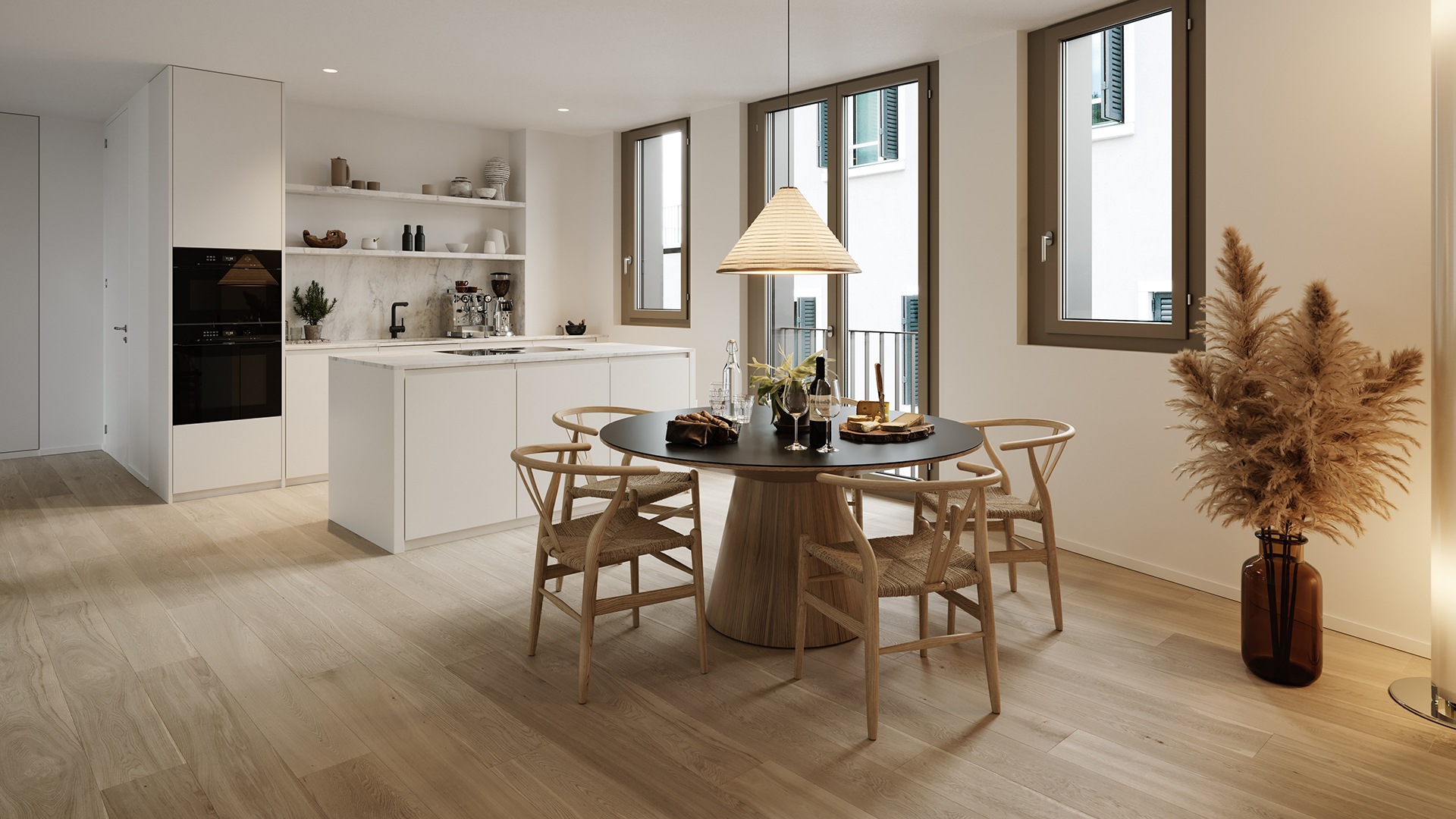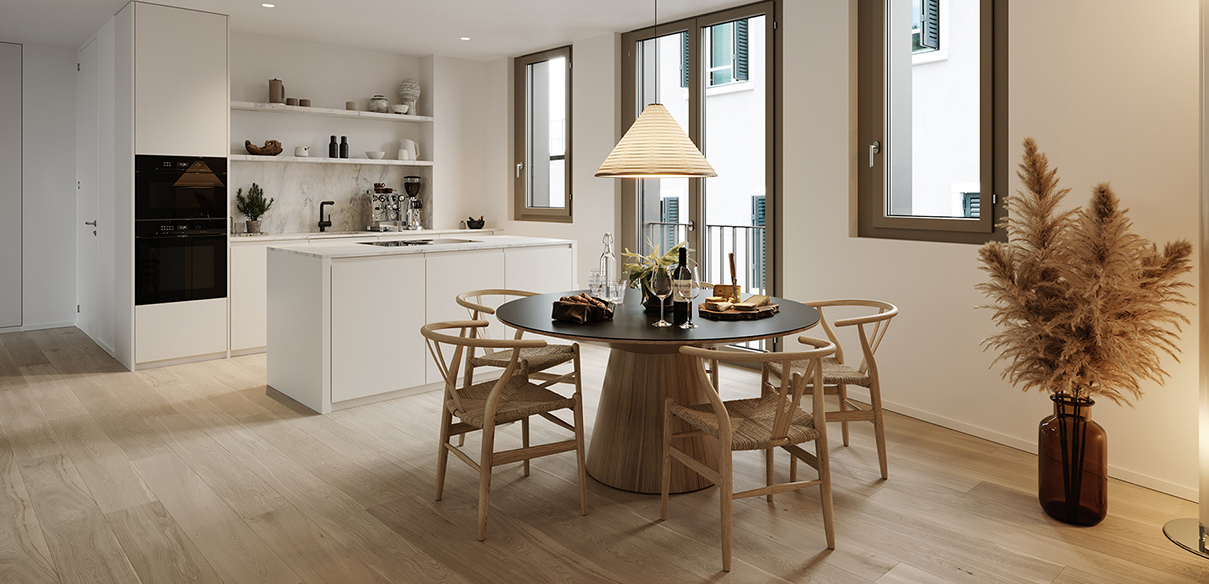 Angelehnt an die Kochinsel Ihrer offenen Küche, halten Sie eine Tasse Tee in der Hand und geniessen achtsam den Moment, in dem sich die «Melodie» mit den hochwertigen Materialen des modernen Innenausbaus vereint.